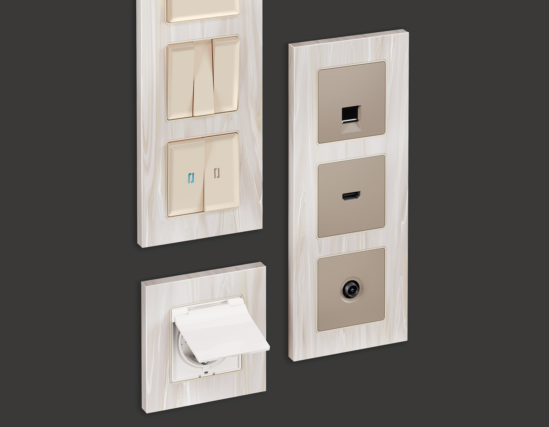 Многогранный ассортимент Ambrella Volt включает в себя механизмы, лицевые панели и рамки, а также комплекты, доступные в различных цветовых решениях. Продукция представлена в модульном исполнении, что позволяет гибко настраивать внешнийвид и функциональность. Вам будет легко заменить лицевую панель, рамку или механизм, найдя идеальное сочетание цветов.
