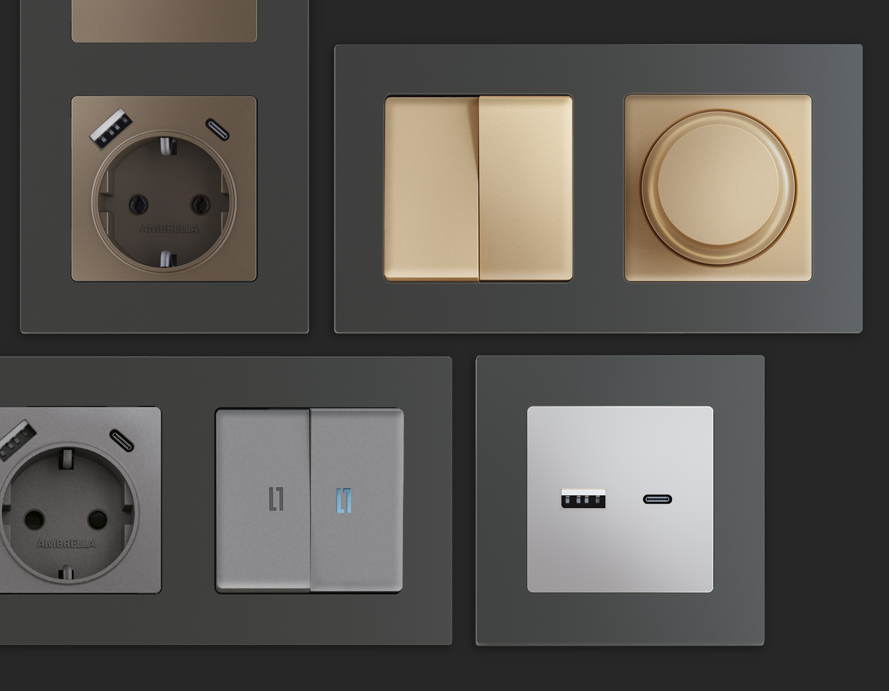 Многогранный ассортимент Ambrella Volt включает в себя механизмы, лицевые панели и рамки, а также комплекты, доступные в различных цветовых решениях. Продукция представлена в модульном исполнении, что позволяет гибко настраивать внешнийвид и функциональность. Вам будет легко заменить лицевую панель, рамку или механизм, найдя идеальное сочетание цветов.