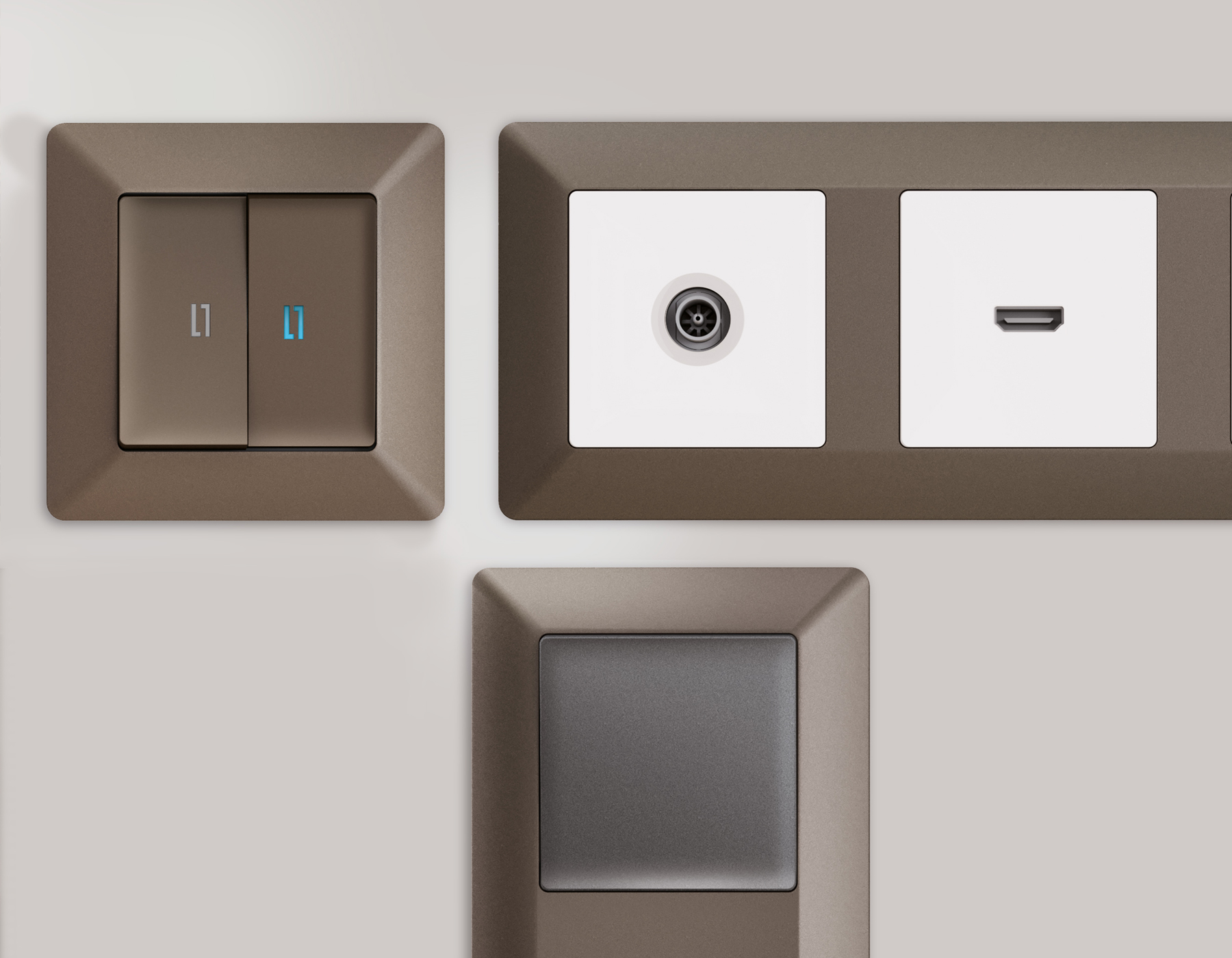 Многогранный ассортимент Ambrella Volt включает в себя механизмы, лицевые панели и рамки, а также комплекты, доступные в различных цветовых решениях. Продукция представлена в модульном исполнении, что позволяет гибко настраивать внешнийвид и функциональность. Вам будет легко заменить лицевую панель, рамку или механизм, найдя идеальное сочетание цветов.