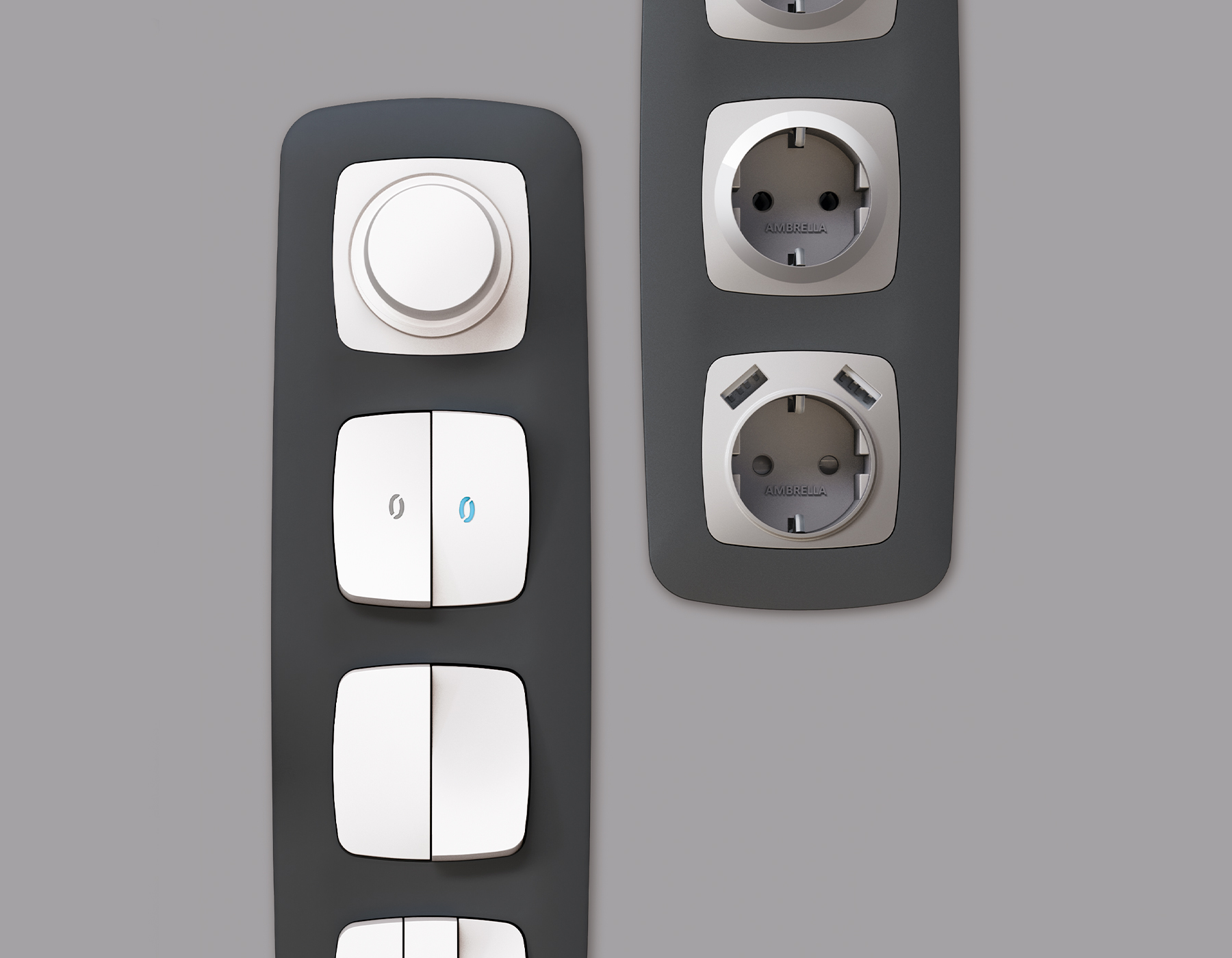 Многогранный ассортимент Ambrella Volt включает в себя механизмы, лицевые панели и рамки, а также комплекты, доступные в различных цветовых решениях. Продукция представлена в модульном исполнении, что позволяет гибко настраивать внешнийвид и функциональность. Вам будет легко заменить лицевую панель, рамку или механизм, найдя идеальное сочетание цветов.