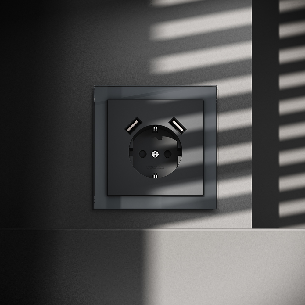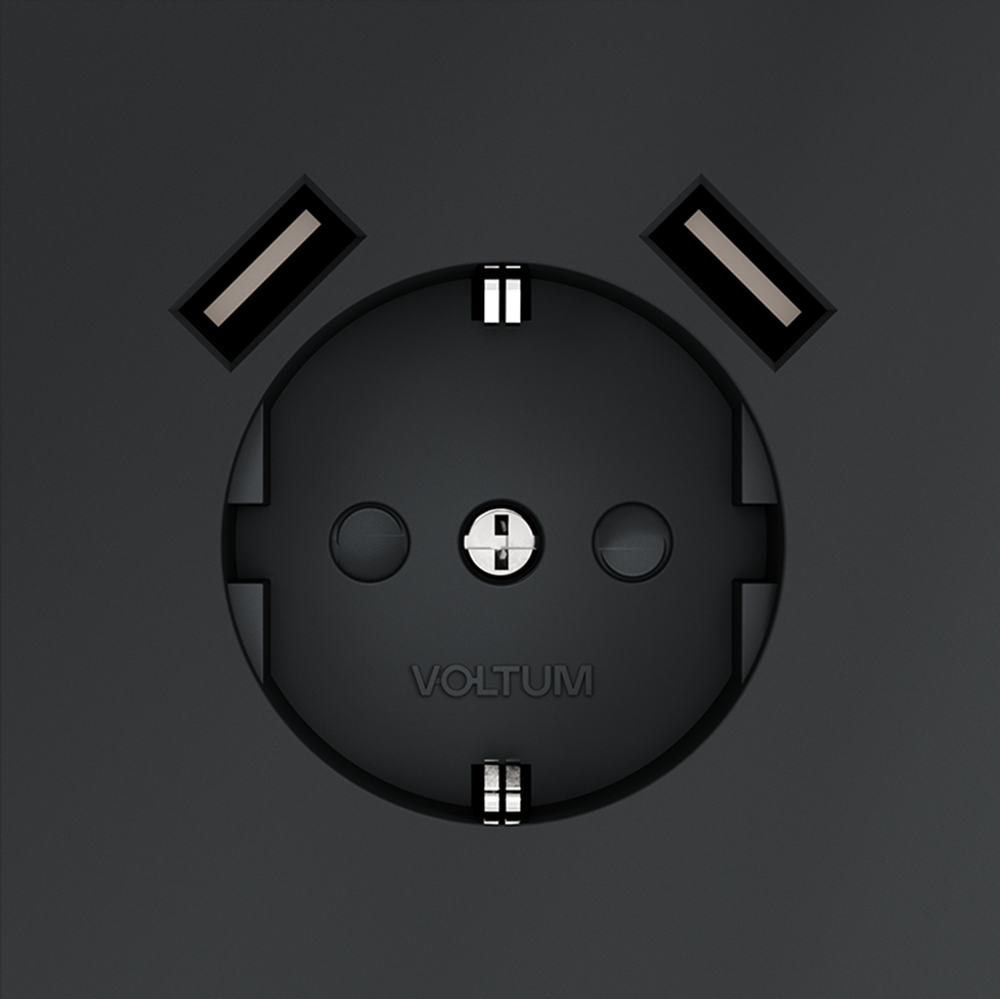Купить "Розетка встраиваемая с заземлением и защитными шторками, 16А, с USB, A+A Voltum S70 VLS040407 (графит)"
