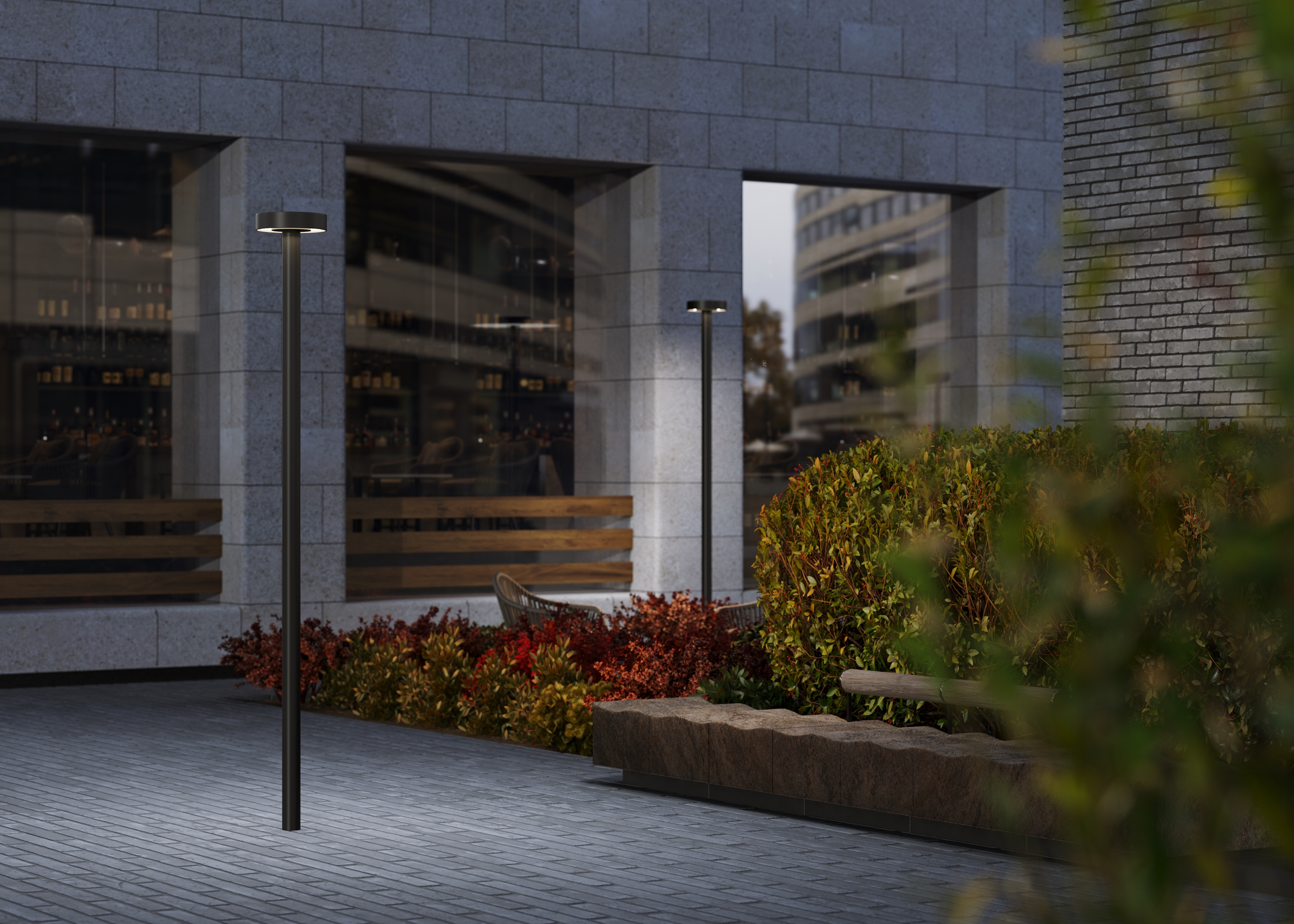 Серия Nail из алюминия черного цвета, плафон — из пластика. LED-источник света, мощность 30 Вт, цветовая температура 3000К, угол рассеивания 85°, степень защиты IP65. Установка на заранее подготовленную поверхность с анкерными креплениями. Лаконичный дизайн предназначен для освещения садовых дорожек и парковых зон.