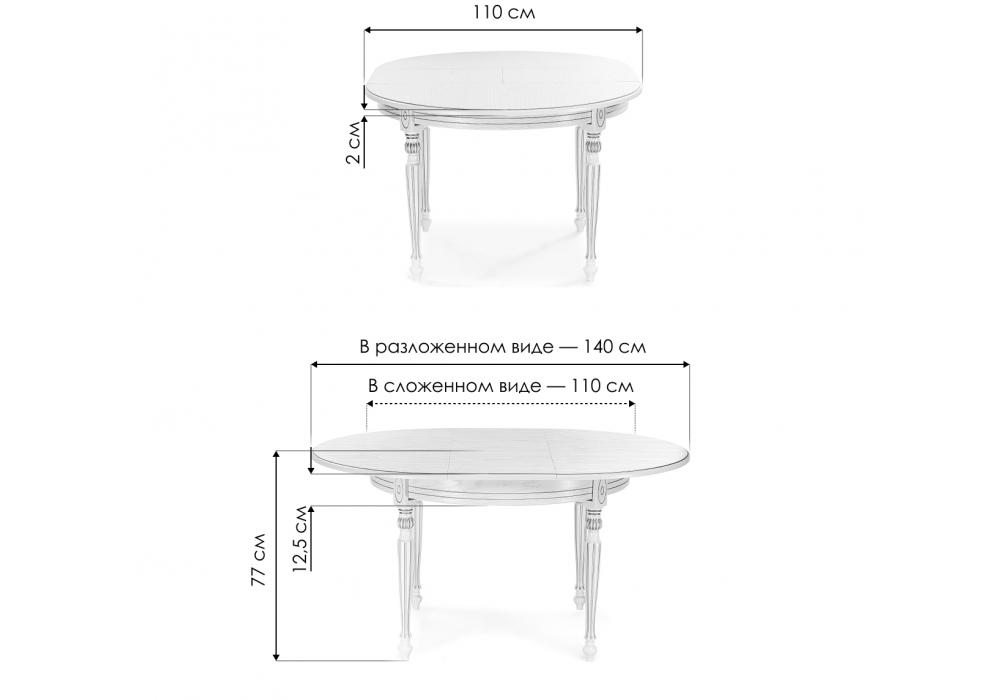 Толщина столешницы: 2 см. Материал каркаса - массив бука; Материал столешницы - Шпон; Ширина - 110; Высота - 77; Длина стола в разложенном виде - 140; Длина - 110;