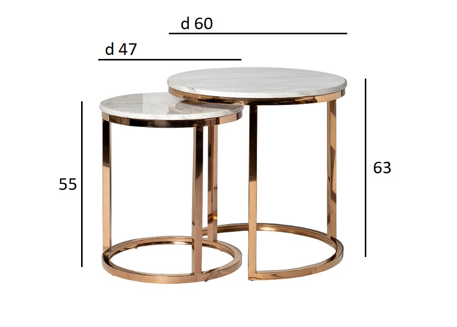 Комплект журнальных столов для гостиной – удачный выбор для посиделок с друзьями или семьей. Предметы сделаны по принципу матрешек. Эти круглые журнальные столы немного различаются размерами. В результате один из них удобно задвигается под другой, экономя пространство. При необходимости столики можно раздвинуть, если у вас намечаются гости. Такой набор журнальных столов выглядит необычайно стильно и презентабельно. Мебель выполнена со вкусом, отвечает современным требованиям качества. В состав входит нержавеющая сталь и искусственный мрамор. Высокое качество материалов обуславливает длительную эксплуатацию предметов интерьера без потери их качеств. Максимальная нагрузка на большой столик - 30кг, на маленький - 25кг. Размеры столов - 60х60х63, 47х47х55 Комплект столов в таком же дизайне, но в большем размере - арт. 57EL-CT101А.