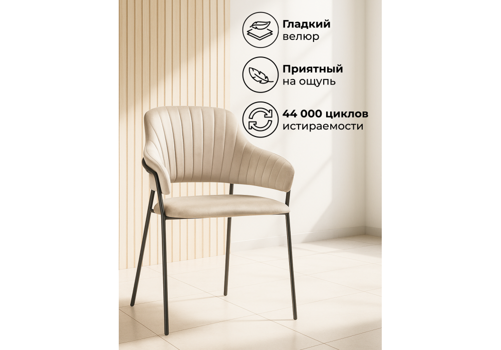 Высота подлокотников: 65 см. Материал каркаса - металл; Материал сиденья - велюр; Материал обивки - велюр; Ширина - 57; Глубина - 56; Высота - 82; Ширина сиденья - 48; Глубина сиденья - 47; Высота сиденья - 49;