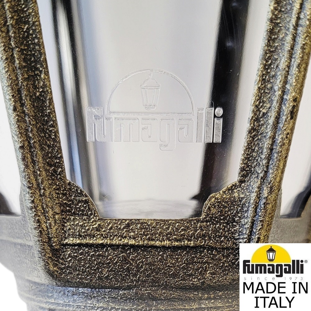 Светильники уличные настенные FUMAGALLI серии ANNA, модель ANNA/BISSO. Консольный уличный светильник для монтажа на стену. Настенный кронштейн BISSO малого размера и светильник ANNA. Используются для фасадного и архитектурного освещения в стиле "классика". Место установки уличных светильников - фасады, колонны и другие вертикальные поверхности исторических зданий, котеджей, загородных домов, церквей, а так же, другие места где требуется и возможна установка фонарей. Изготовлены в Италии, по уникальным технологиям "FUMAGALLI" из современного композитного полимера RESIN. Этот материал в 5 раз прочнее металла, не ржавеет, не окисляется, не выгорает на солнце, его не нужно красить. Все светильники пыле-влаго защищены по стандарту IP55 (защита от пыли, защита от струй воды, падающих под любым углом). Рассеиватель выполнен из антивандального, не мутнеющего и не горючего PMMA (ПолиМетилМетаАкрилат). Срок службы светильника - не менее 20 лет. Температура использования от -60 до +90. В серии ANNA есть фонари в настенном (BISSO/ANNA, PORPORA/ANNA) подвесном (SICHEM/ANNA, SICHEM/ANNA 3L) и наземном исполнении (IAFAET.R/ANNA, ALOE.R/ANNA, ARTU/ANNA, GIGI/ANNA, RICU/ANNA, RICU/ISSO/ANNA 1L, RICU/ISSO/ANNA 2L, RICU/ISSO/ANNA 3L) со столбами разной высоты, с разным количеством и конфигурацией голов. Консоли настенных фонарей и кронштейны светильников на столбах освщения могут устанавливаться вверх/вниз. Столбы выше 150 см имеют в основе мощную стальную трубу с двойной оцинковкой. При заказе требуется выбрать цвет корпуса, цвет плафона и тип патрона. Возможен светодиодный вариант с LED цоколем GX-53. По стилю и дизайну серия уличных светильников ANNA похожа на светильники среднего размера серии RUT и на светильники большого размера серии NOEMI. По размеру ANNA относится к малым светильникам как серия SABA и GLOBE 250.