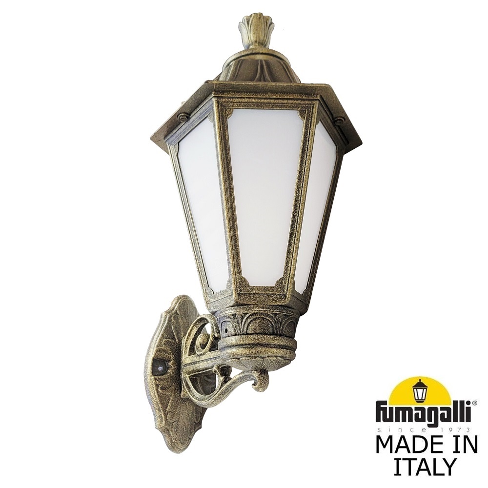 Светильники уличные настенные FUMAGALLI серии RUT, модель RUT/BISSO. Консольный уличный светильник для монтажа на стену. Настенный кронштейн BISSO малого размера и светильник RUT. Монтаж фонаря "вверх". Используются для фасадного и архитектурного освещения в стиле "классика". Место установки уличных светильников - фасады, колонны и другие вертикальные поверхности исторических зданий, котеджей, загородных домов, церквей, а так же, другие места где требуется и возможна установка фонарей. Изготовлены в Италии, по уникальным технологиям "FUMAGALLI" из современного композитного полимера RESIN. Этот материал в 5 раз прочнее металла, не ржавеет, не окисляется, не выгорает на солнце, его не нужно красить. Все светильники пыле-влаго защищены по стандарту IP55 (Пылезащищенные, защита от водяных струй с любого направления). Рассеиватель выполнен из антивандального, не мутнеющего и не горючего PMMA (ПолиМетилМетаАкрилат). Срок службы светильника - не менее 20 лет. Температура использования от -60 до +90. В серии RUT есть фонари в настенном (BISSO/ RUT, OFIR/ RUT, MIRRA/ RUT, PORPORA/ RUT) подвесном (SICHEM/ RUT) и наземном исполнении (MINILOT/ RUT, MIZAR.R/ RUT, IAFAET.R/ RUT, ALOE.R/ RUT, ARTU/ RUT, GIGI/ RUT, RICU/ RUT, RICU/ISSO/ RUT 2L, NEBO/ RUT, NEBO OFIR/ RUT 2L, NEBO OFIR/ RUT 3L) со столбами разной высоты, с разным количеством и конфигурацией голов. Консоли настенных фонарей и кронштейны светильников на столбах освщения могут устанавливаться вверх/вниз. Столбы выше 150 см имеют в основе мощную стальную трубу с двойной оцинковкой. При заказе требуется выбрать цвет корпуса, цвет плафона и тип патрона. По стилю и дизайну серия уличных светильников RUT похожа на светильники малого размера серии ANNA и на светильники большого размера серии NOEMI. По размеру RUT относится к средним светильникам как серия CEFA, SALEM и GLOBE 300.