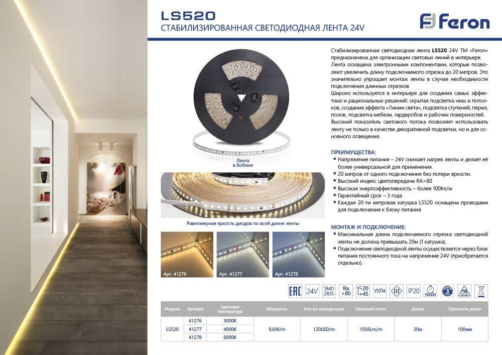 Светодиодная лента Feron 9, 6W/m 120LED/m 2835SMD холодный белый 20M LS520 41278 во Владимире