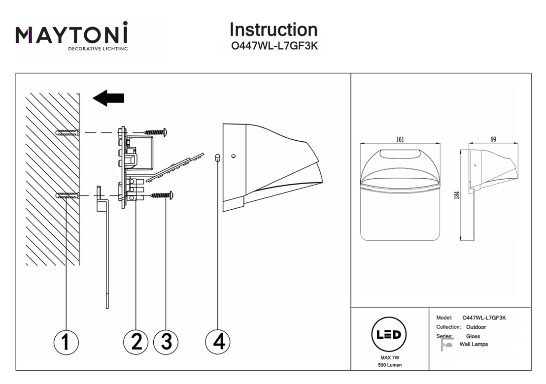 Уличный настенный светодиодный светильник Maytoni Gloss O447WL-L7GF3K — это надёжный и долговечный осветительный прибор, который прослужит вам долгие годы, не теряя своей яркости и качества света. Данную модель O447WL-L7GF3K можете купить в интернет-магазине 220svet.