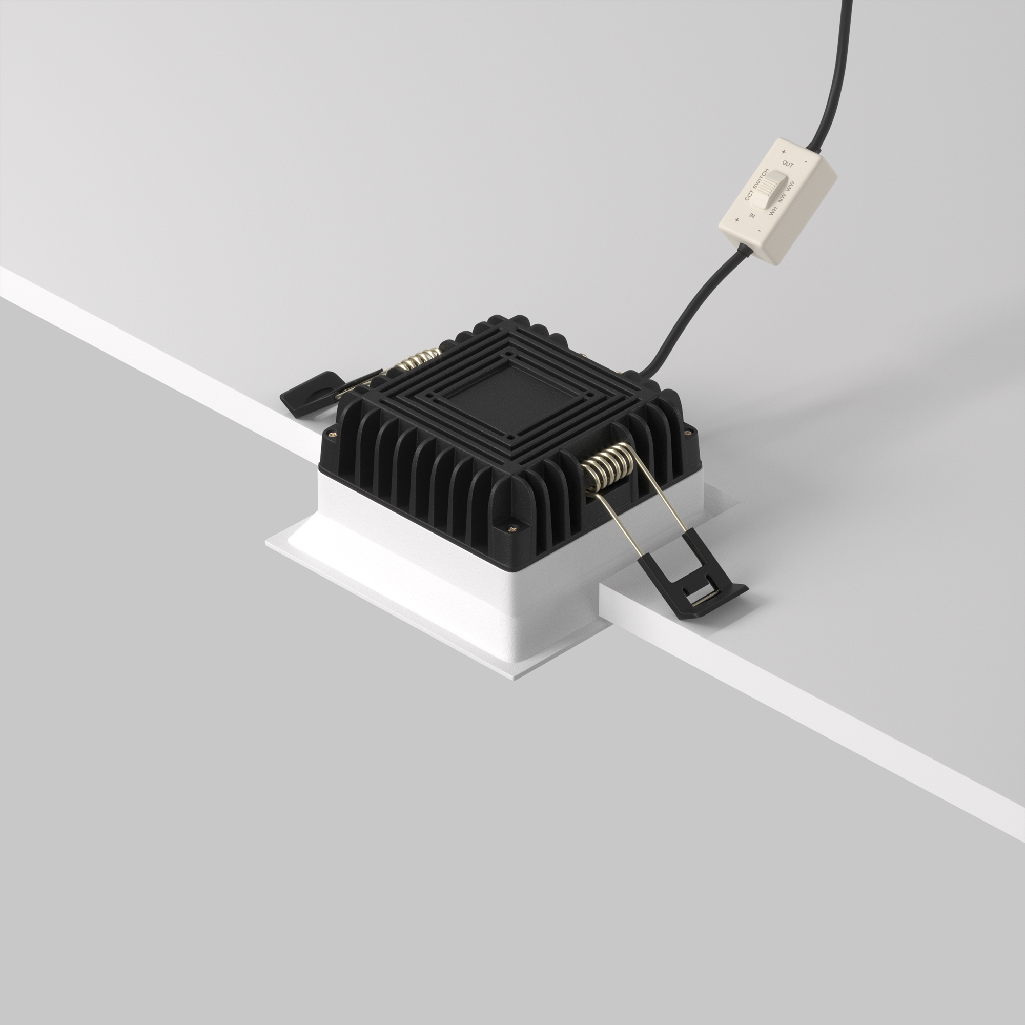Материал арматуры - алюминий и пластик. Организация основного освещения в интерьере. Высокий коэффициент цветопередачи >90. Качественное отображение цветов. Утопленный матовый рассеиватель. Переключатель цветовой температуры. Повышенная степень пылевлагозащиты IP 44.